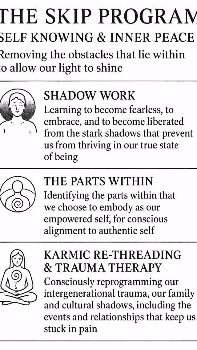 The SKIP Program is the programmatic application of a strategic series of proven somatic and psychological methodologies designed to generate deep, embodied purification and conscious clarification across body, mind, and spirit.
